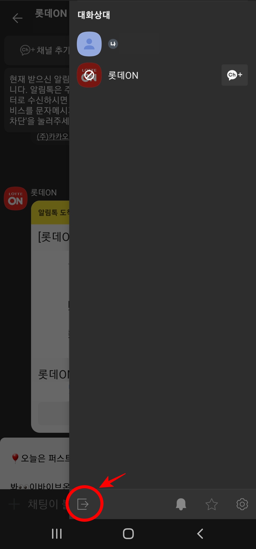 현재있는 방에 참여한 대화 상태 정보가 나오는데요, 아래쪽에 나가기 아이콘이 있습니다.