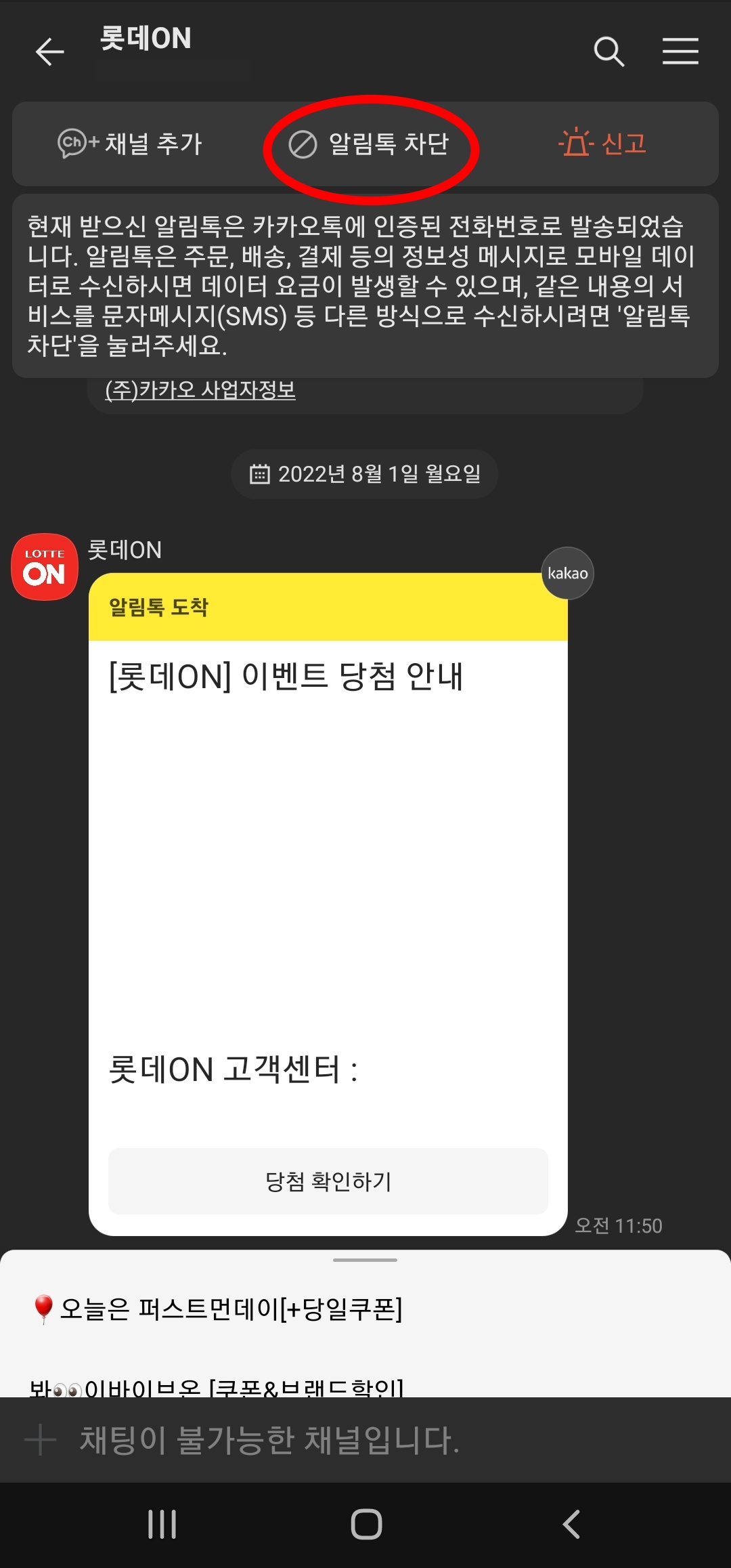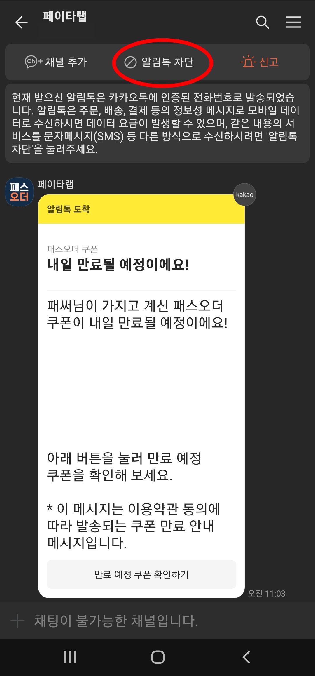 채널 추가하지 않은 곳에서 알림톡이 왔을 때 차단 방법
