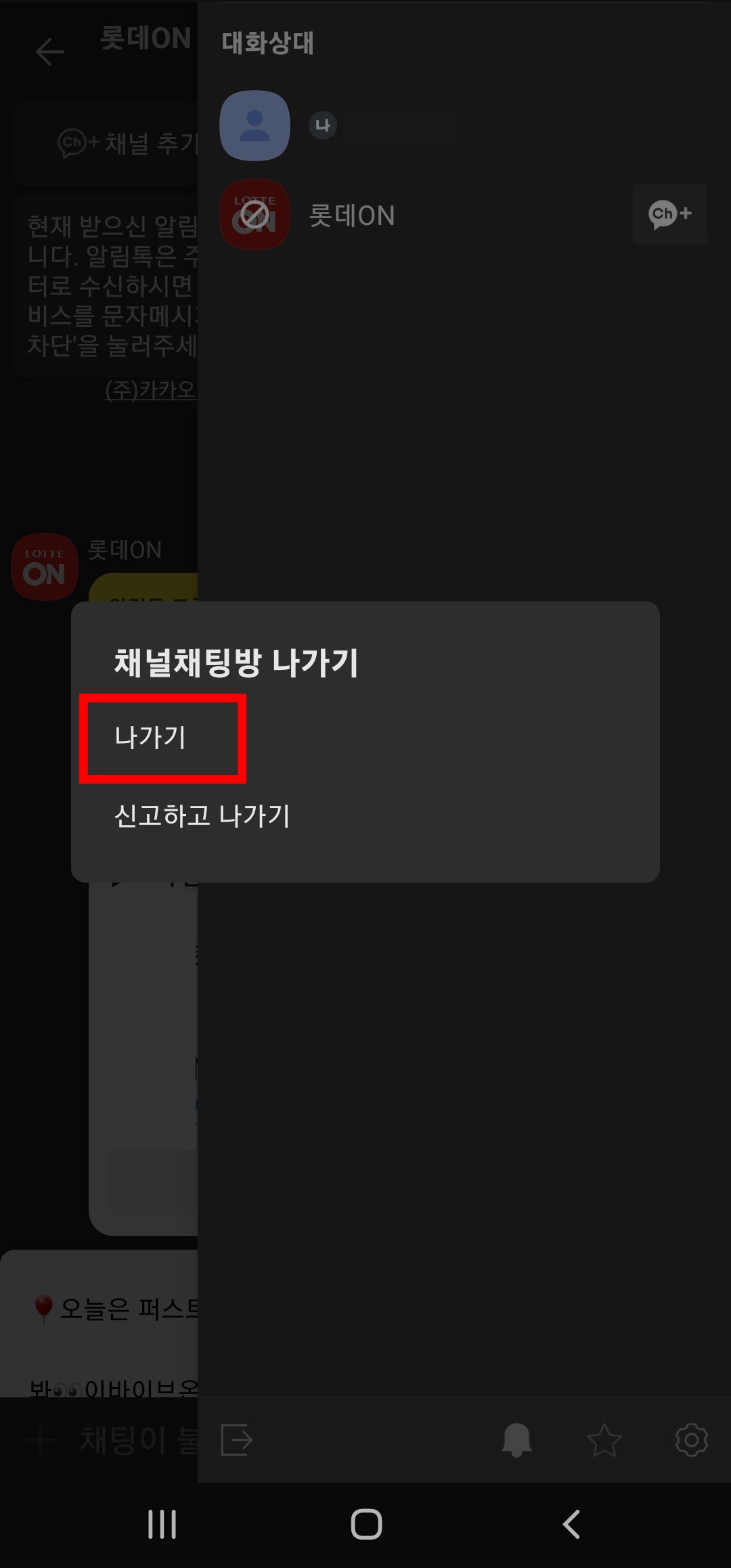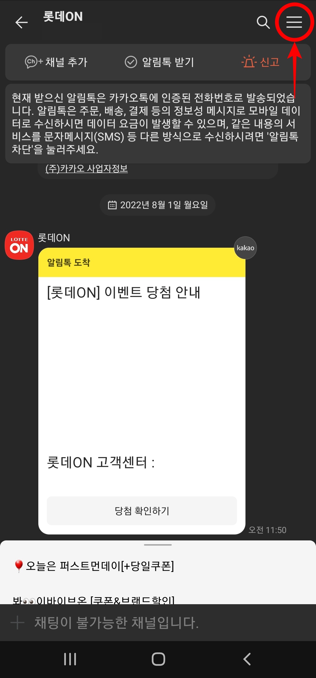 만약 알림톡 방에서 위에서 알아본 것 처럼 상단바가 보이지 않는다면 아마도 해당 기업을 채널 추가하셨을 가능성이 큽니다. 이때에는 채널 자체를 차단한뒤 진행해 주셔야 합니다.