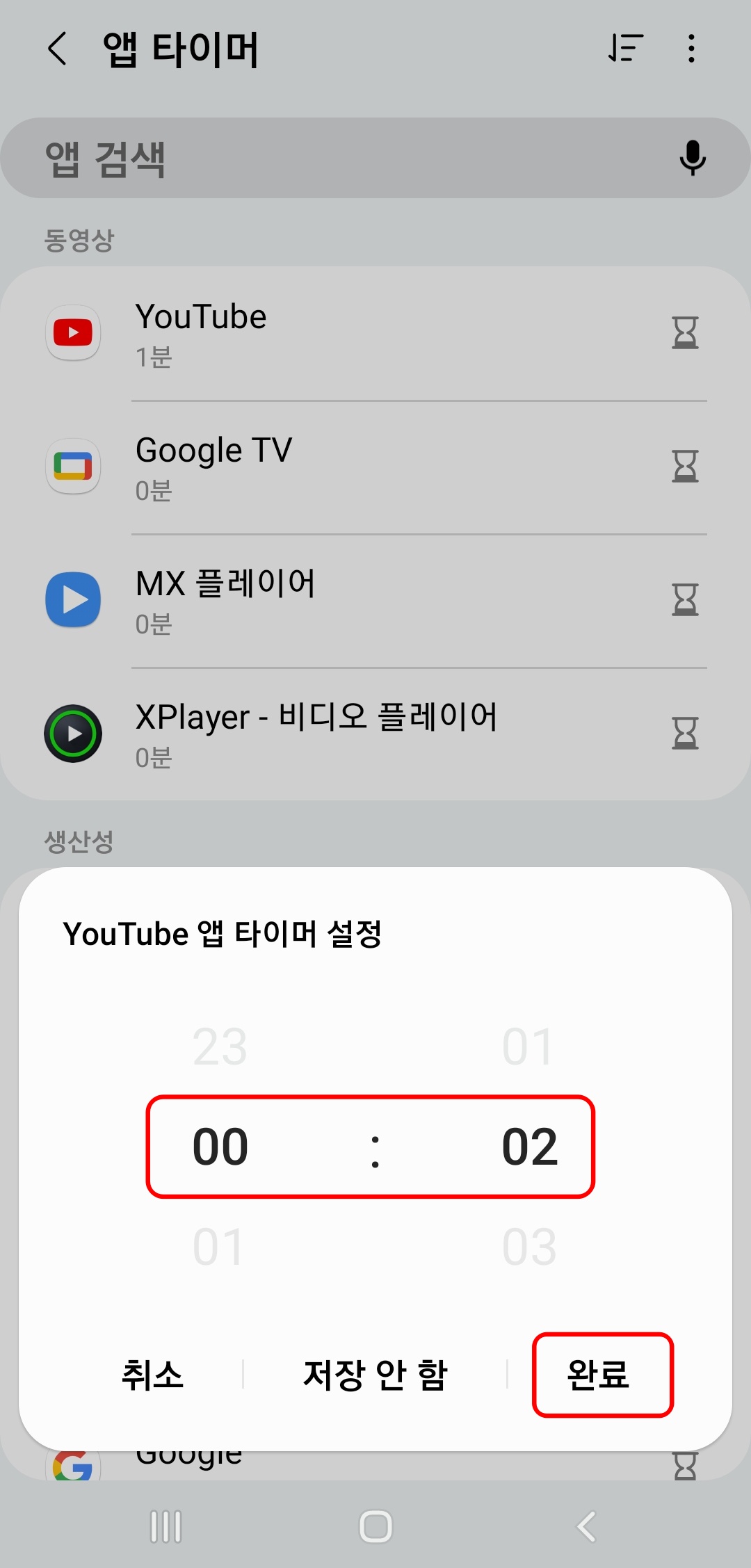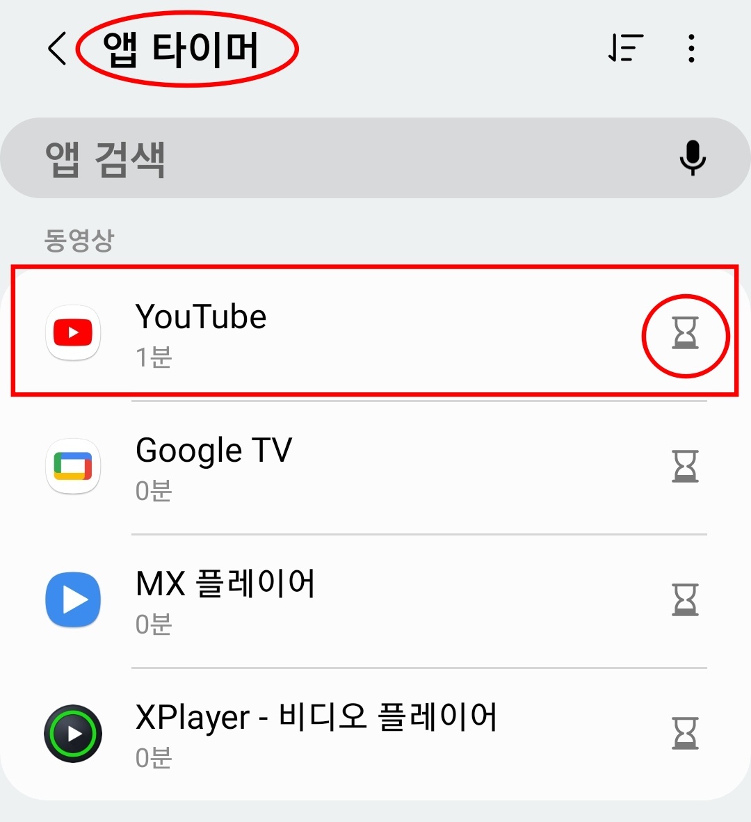 여기로 와보면 카테고리 별로 현재 핸드폰에 설치되어있는 앱 목록이 나오는데요, 자주 쓰는, 혹은 사용을 제한 하고 싶은 앱을 찾아서 우측의 모래시계 아이콘을 선택해 주시면 됩니다. 저는 예를들기 위해 유튜브를 지정해 보겠습니다.