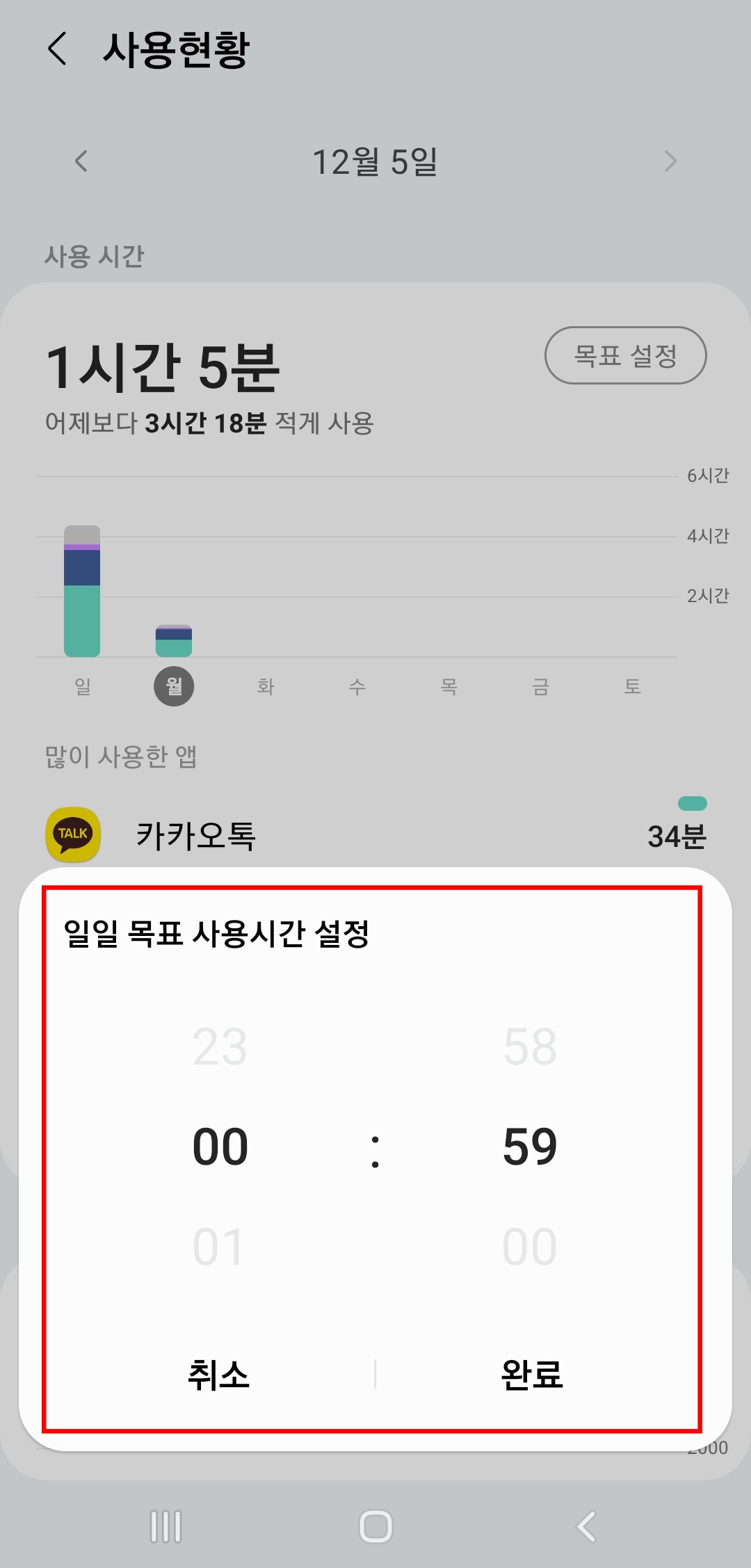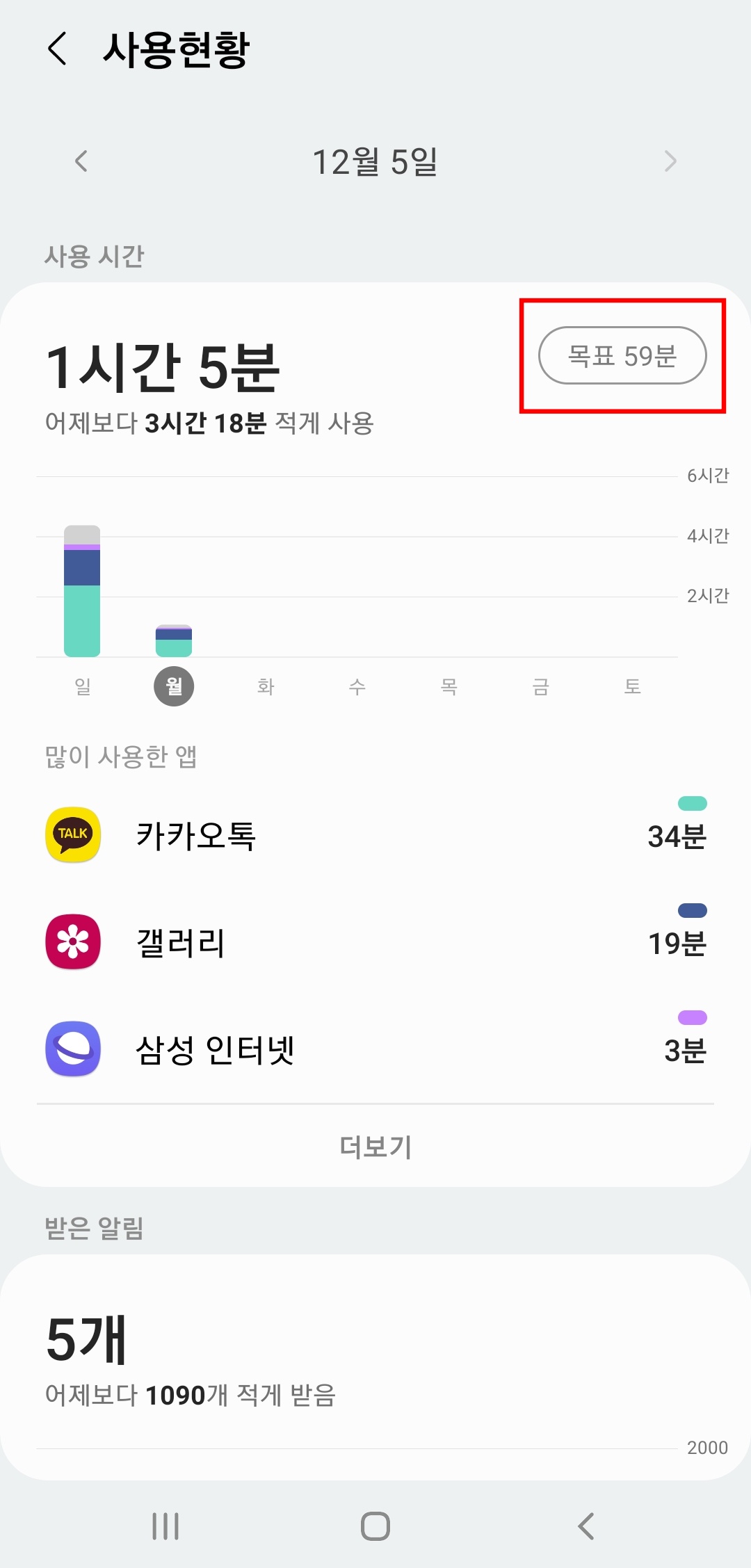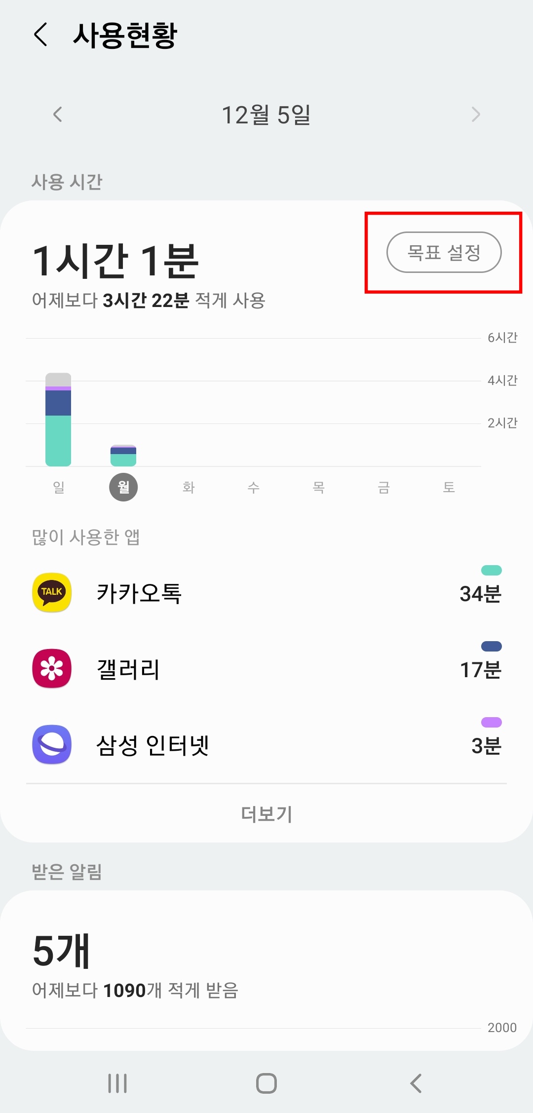 사용 현황에서 일단 전체적인 시간이 나오고, 아래로는 많이 사용한 앱 리스트가 나오는데, 일단은 상단의 (목표 설정)을 해봅시다. 해당 설정은 개별 앱이 아닌, 스마트폰의 전체적인 사용시간의 목표를 정할 수 있습니다.