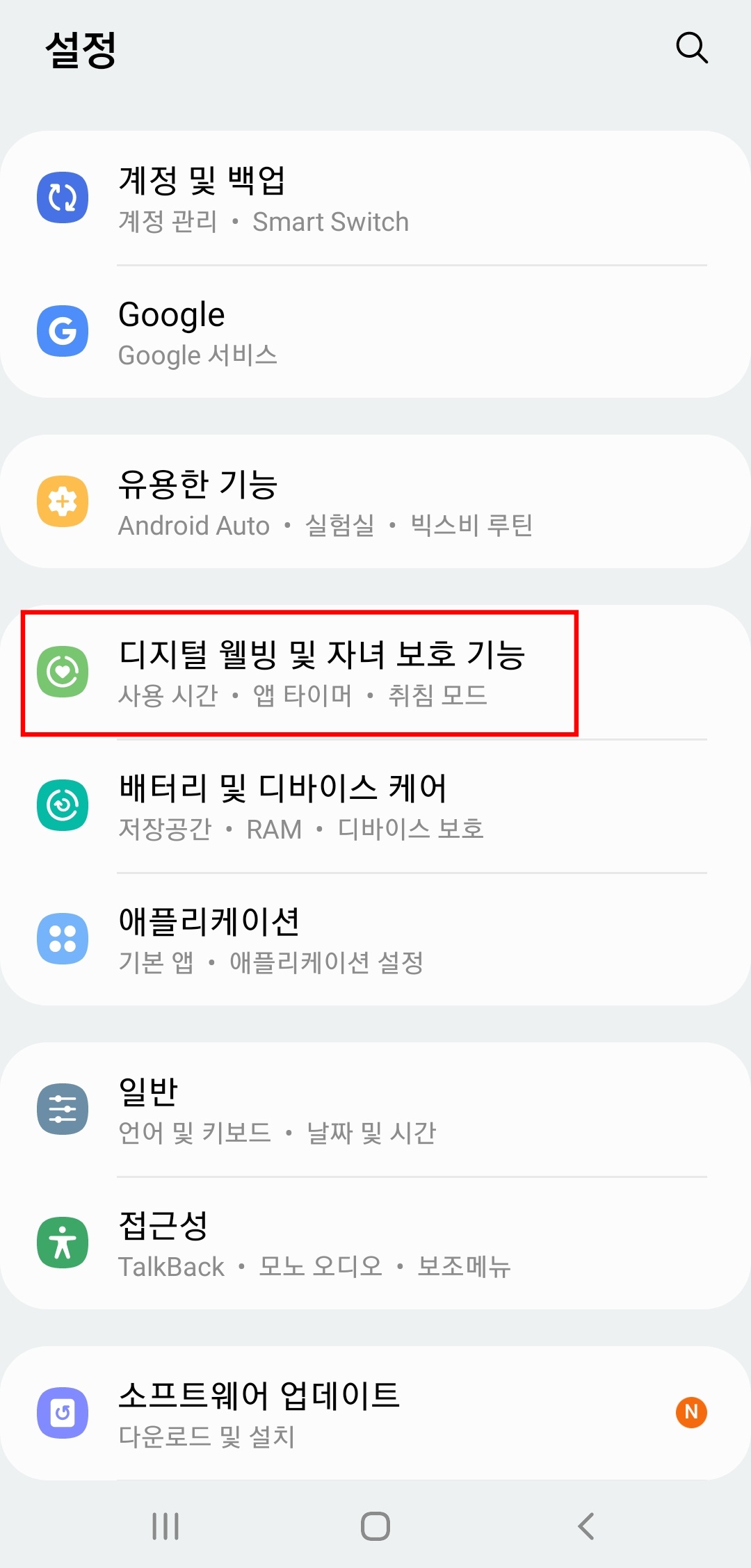 여러 항목들을 지나 내려와 보면 (디지털 웰빙 및 자녀 보호 기능)이 있습니다. 이곳에서 사용시간 관리나 앱 타이머 기능을 사용할 수 있는데요, 여기로 진입합니다.