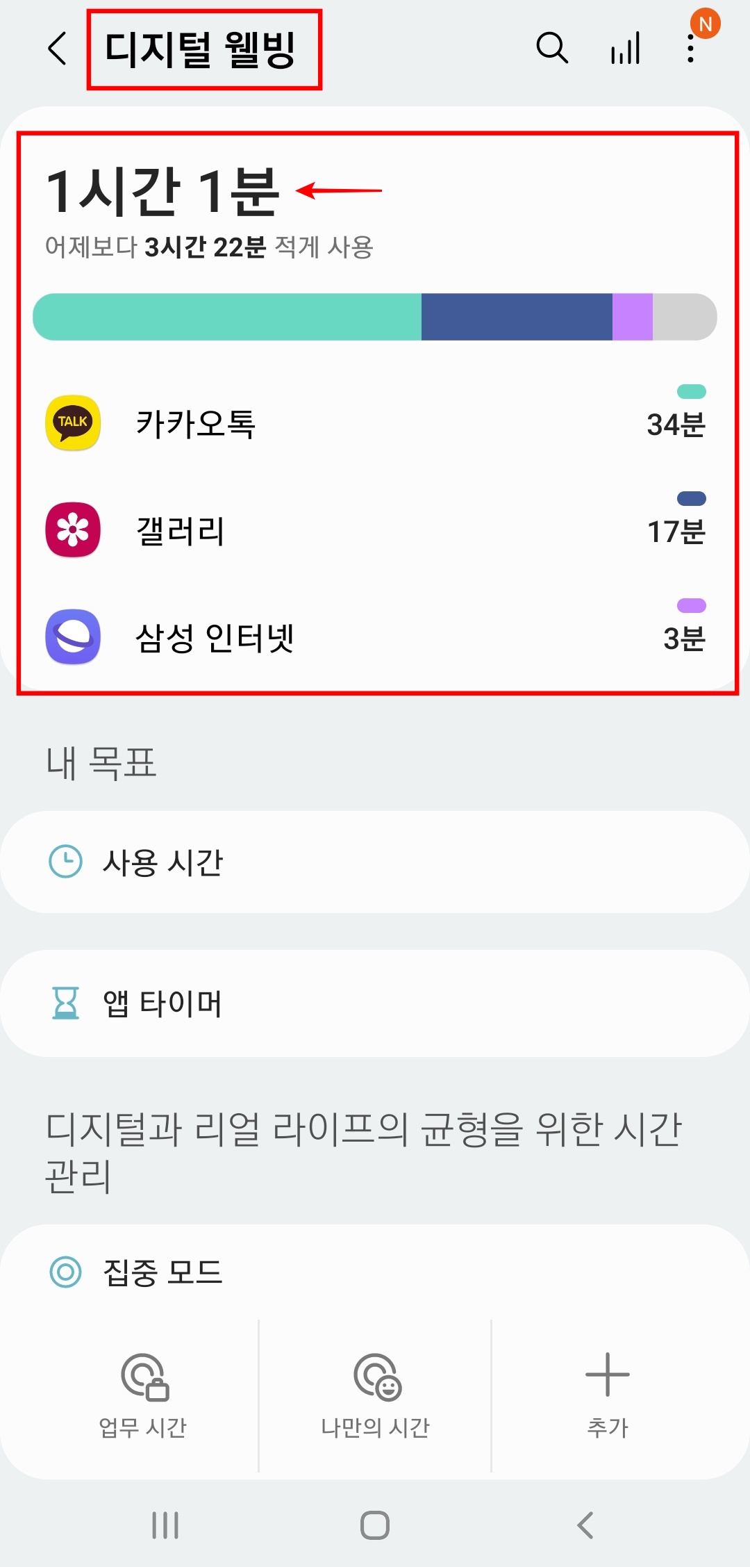 처음 시작시 (디지털 웰빙) 및 (자녀 보호 기능) 둘중에 하나로 들어갈 수 있는데, 여기서는 디지털 웰빙으로 시작해 봅시다. 정상적으로 들어오셨다면, 가장 먼저 전면에 오늘을 기준으로 스마트폰을 사용한 전체 시간이 나옵니다. 저는 현재 1시간 1분을 사용했는데요, 이 시간 부분을 통해 가보면 상세 정보가 나오게 됩니다.
