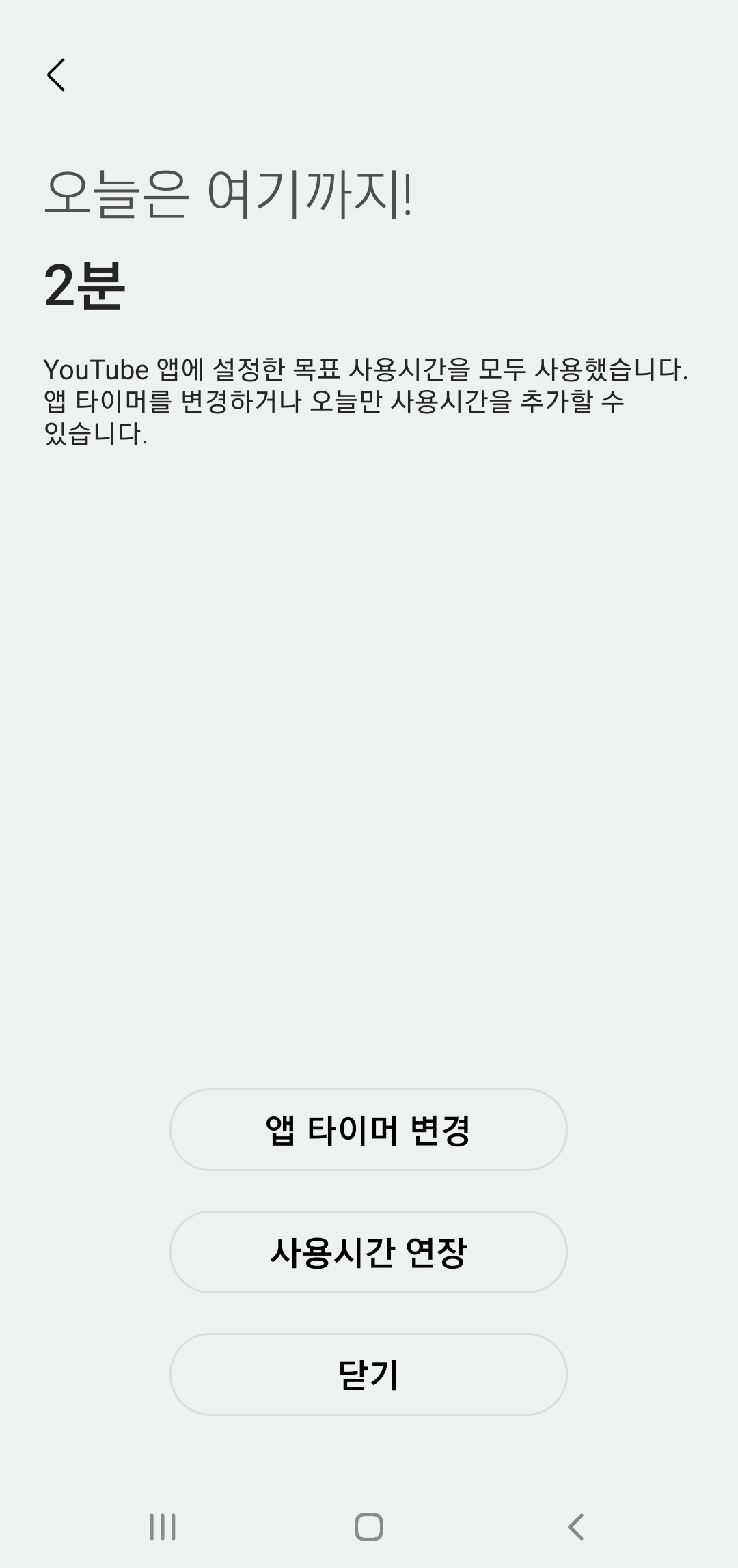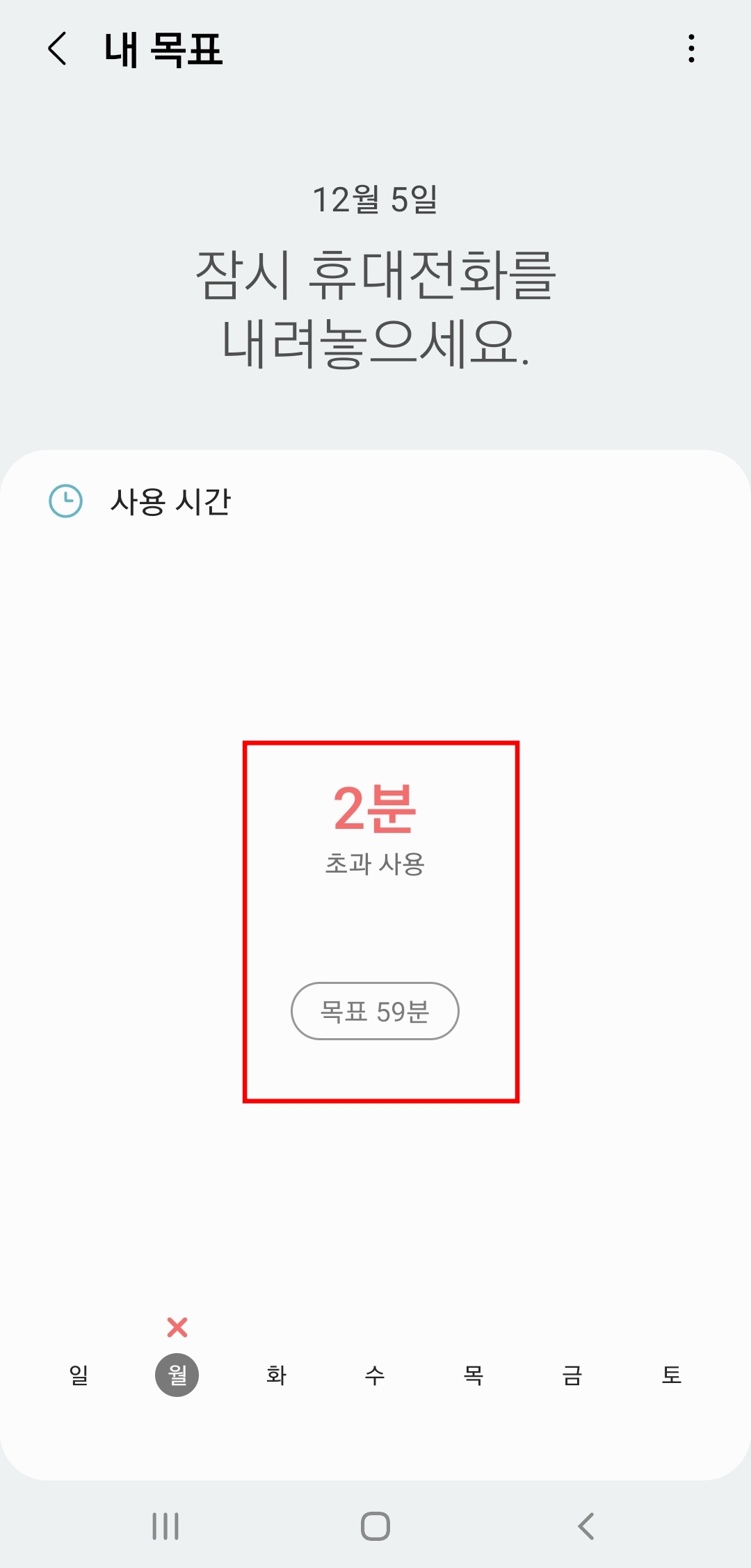 이제 목표한 시간 경과하게 되면 잠시 휴대전화를 내려 놓으세요 라는 문구와 함께 초과로 사용한 시간이 나오게 됩니다. 그런데 이 기능은 내가 얼마만큼의 스마트폰을 썼는가를 확인하여 스스로 관리하는 정도의 기능이므로 강제성이 조금 떨어지는 것을 느꼈습니다. 그래서 이 부분은 세부 앱 사용제한을 사용하면 해결됩니다.