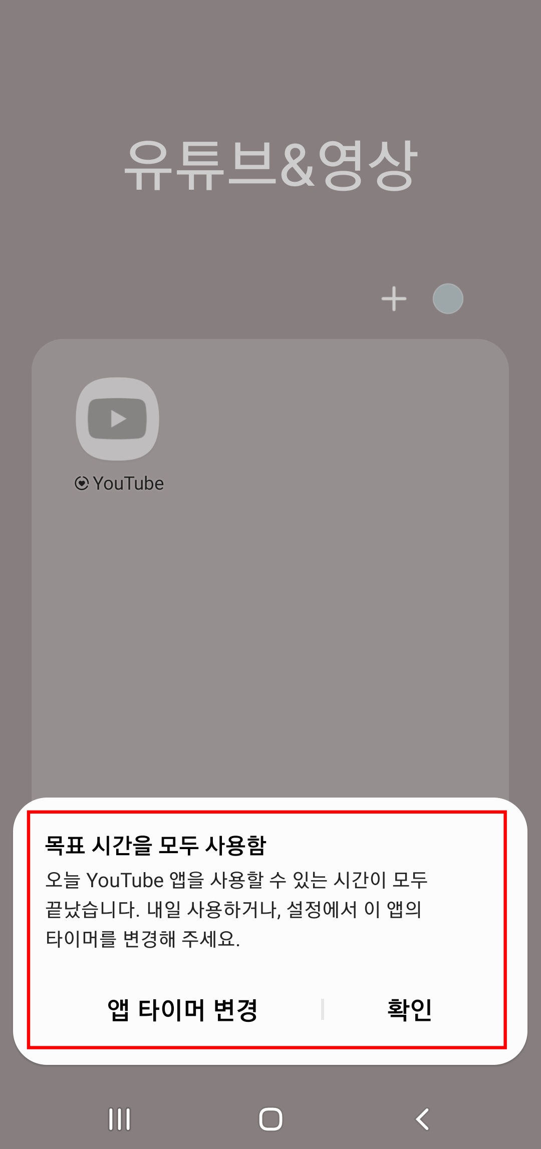 회색으로 바뀐 앱 아이콘을 실행해 보려했지만 (목표 시간을 모두 사용함) 안내 문구가 뜨며, 내일 다시 사용하거나 앱 타이머를 변경하라는 메시지가 떴습니다. 이렇게 해놓고 나니 자연적으로 사용을 절제하며 그만하게 되는 효과가 있더라구요. 간단하면서도 빠르게 앱 시간을 제한 할 수 있으므로 활용해보시면 좋을 것 같습니다.